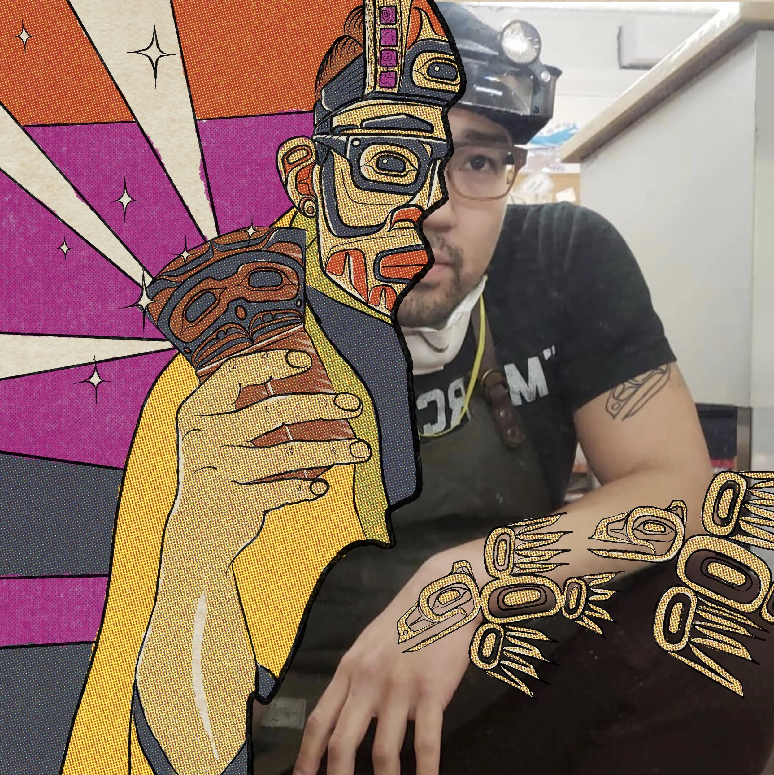“At its center, [this design] depicts an eye… symbolizing the concept that what we study also views us back. The environment responds to our understanding and how we interact with it, [so the eye] reminds us of that the land relates back to us as we relate to it. The outer part [of this design] represents salmon fins. The whole design is made to feel solid and wholistic. Emphasizing the weight of land [and waters]. The strength of [them].”
