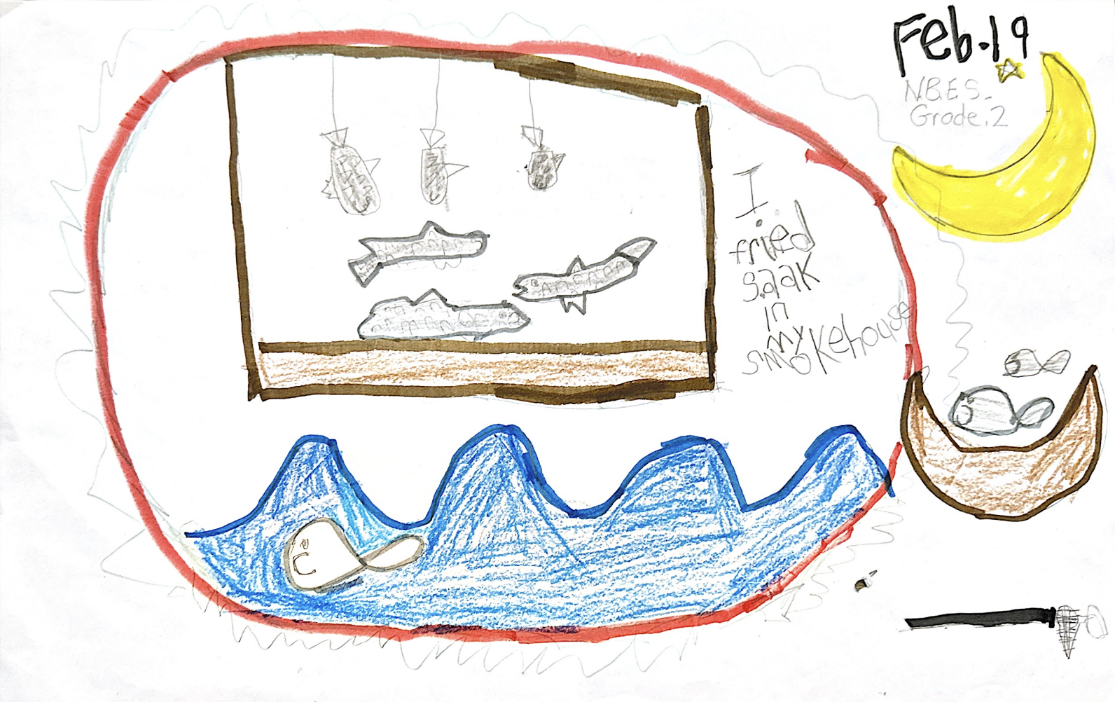 In 2026, we launched an art and story contest, inviting Nisg̱a’a youth from the elementary level through to young adults to submit works that showcase how they see saak being connected to the health of the Nisg̱a’a people and the future they envision for saak and the Nisg̱a’a Nation. A community panel helped select 1st, 2nd, and 3rd place prize winners from the elementary junior (Grade 1-3) and senior (Grade 4-7) levels, as well as young adults (ages 18-35) – showcased below!